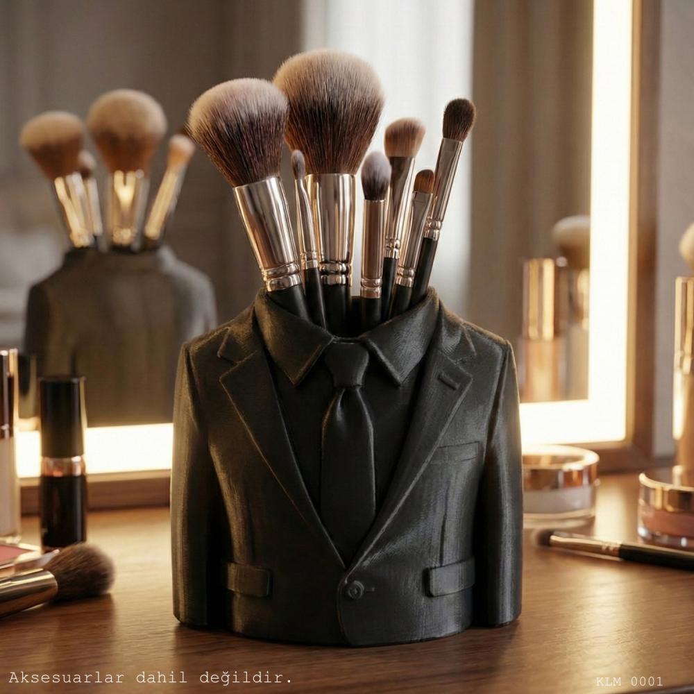 Siyah ceket formunda tasarlanan bu masaüstü organizer, makyaj fırçaları ve kozmetik aksesuarlar için hem dekoratif hem de işlevsel bir düzenleme sunar. Sert plastik gövdesi sayesinde sağlam bir yapıya sahiptir ve makyaj masası üzerinde dengeli şekilde durur.