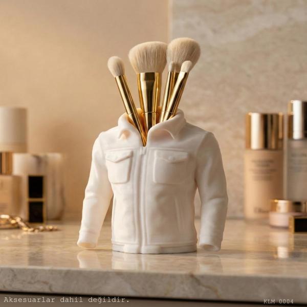 Beyaz deri ceket formunda tasarlanan bu masaüstü organizer, makyaj fırçaları ve kozmetik aksesuarlar için hem dekoratif hem de işlevsel bir düzenleme sunar. Sert plastik gövdesi sayesinde sağlam bir yapıya sahiptir ve makyaj masası üzerinde dengeli şekilde durur.