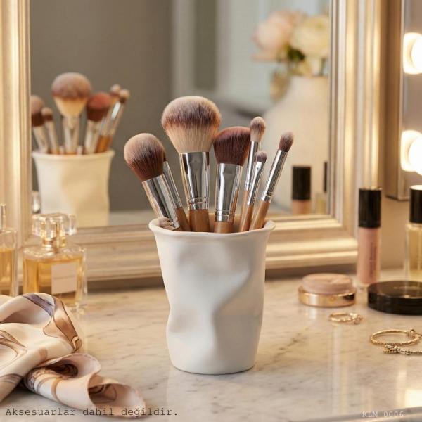 Beyaz renkte üretilen bu makyaj fırçalığı, özel olarak verilmiş yamuk formlu bardak tasarımına sahiptir. Dalgalı ve eğimli gövdesi sayesinde klasik fırçalıktan farklı olarak modern ve dekoratif bir görünüm sunar.