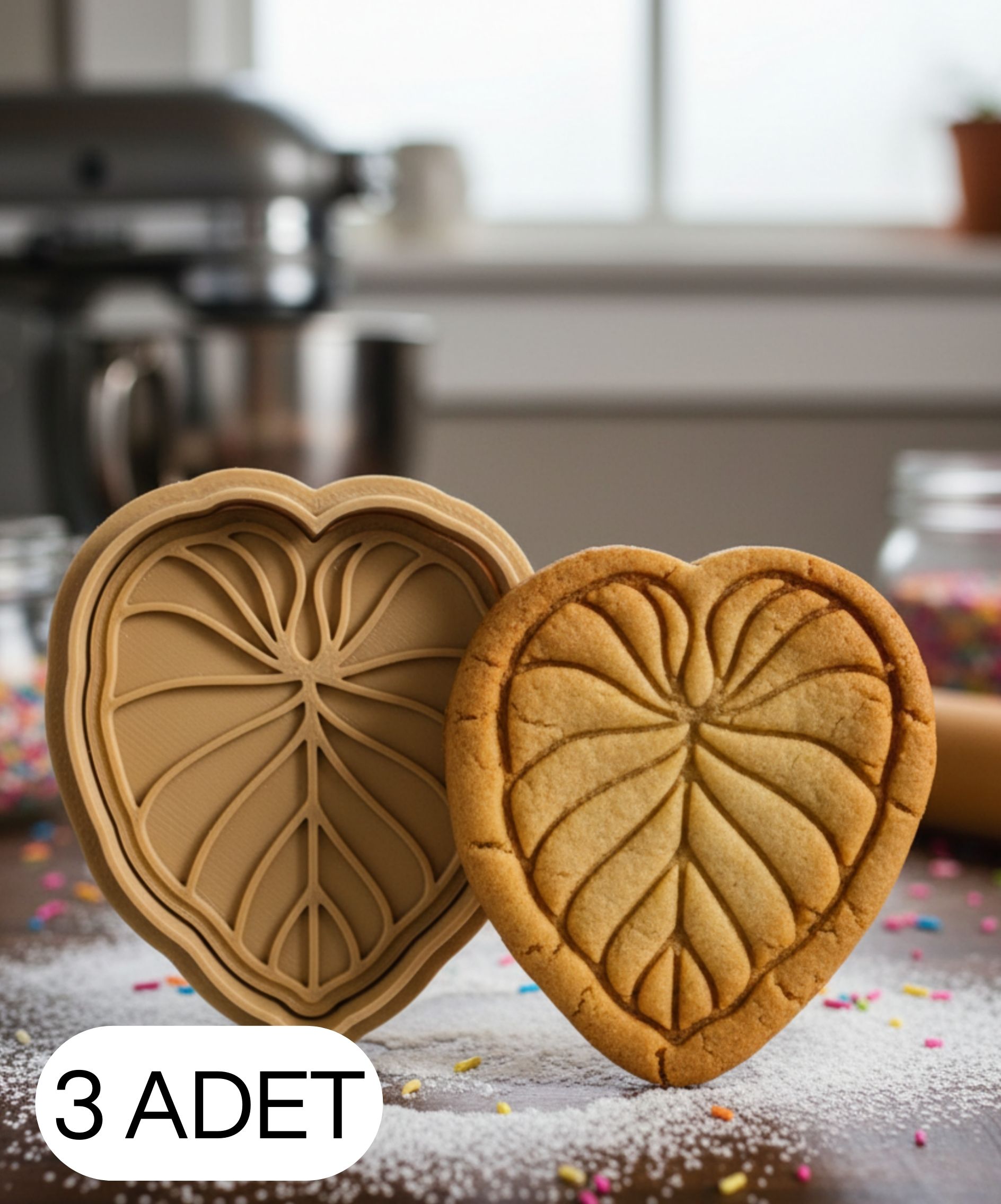 Bu çift parçalı kalp yaprak kalıbı, gıda temasına uygun PLA malzemeden üretilmiştir. Kalp formundaki tropik yaprak çizgileri, damar detayları ve zarif şekli sayesinde kurabiyelerde, şeker hamurunda ve oyun hamuru çalışmalarında son derece net ve pürüzsüz sonuç elde edilmesini sağlar.