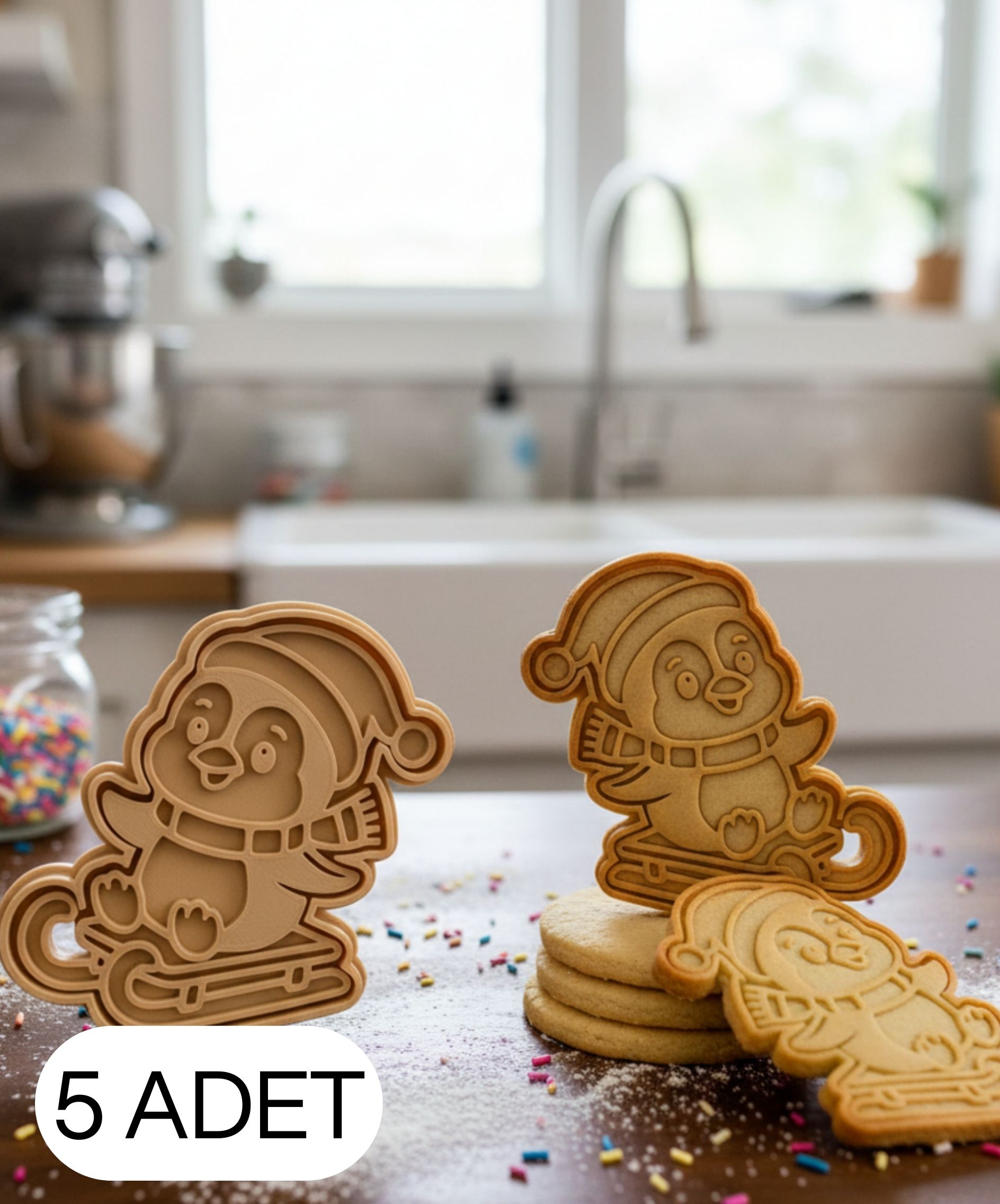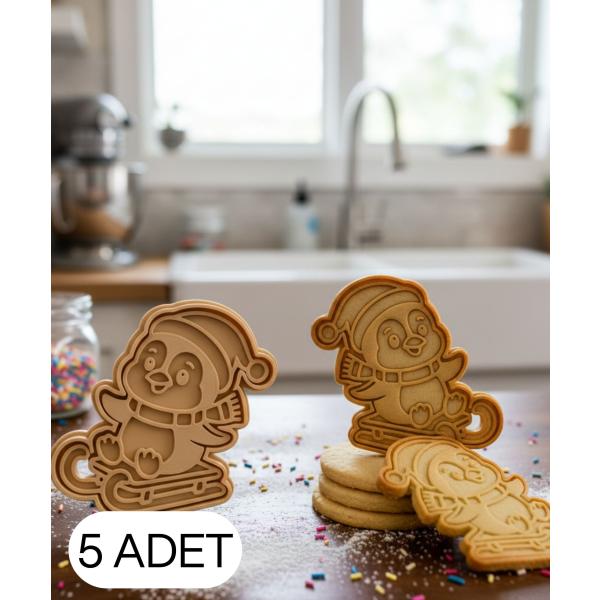 Kar kızağında penguen figürlü Noel kurabiye kalıbı, gıda temasına uygun PLA malzemeden üretilmiştir. Penguenin şapka, yüz ve kızak detayları sayesinde kurabiye, şeker hamuru ve oyun hamuru çalışmalarında net, pürüzsüz ve karakterli şekiller elde edilir.