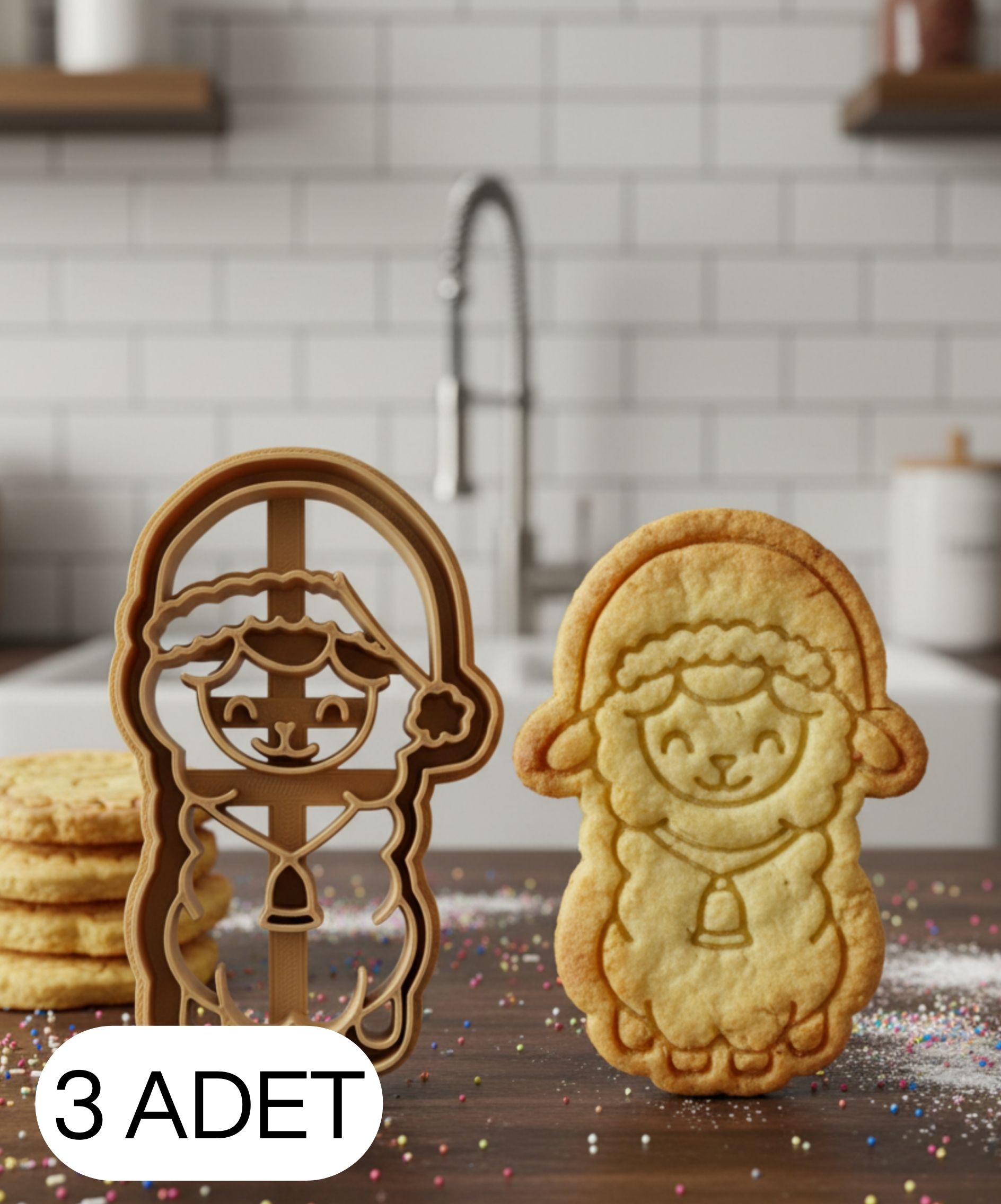 Çanlı Noel kuzusu figürlü kurabiye kalıbı, gıda temasına uygun PLA malzemeden üretilmiştir. Şapkası, kulakları, yüz ifadesi ve boynundaki çan detayı sayesinde kurabiye, şeker hamuru ve oyun hamuru çalışmalarında net, pürüzsüz ve karakterli şekiller elde edilir.