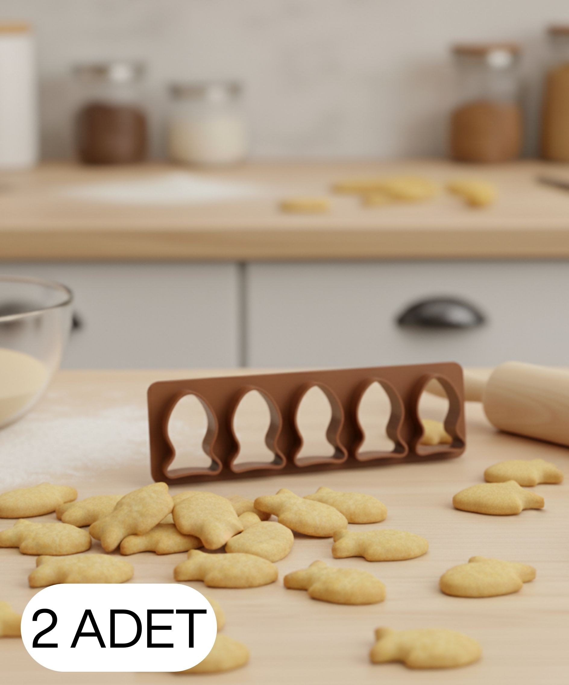 Bu ürün dış kesici ve tek parça çoklu form olmak üzere 5’li balık figürlü tek gövdeden oluşmaktadır. Balık şekilli kraker ve kurabiye kalıbı, gıda temasına uygun PLA malzemeden üretilmiştir. Kraker hamuru, kurabiye hamuru, şeker hamuru ve oyun hamuru çalışmalarında net, dengeli ve seri kesim sağlar. Tek bastırma ile aynı ölçüde 5 adet balık figürü elde edilir. Çocuklara yönelik atıştırmalıklar, okul ikramları, balık temalı sunumlar ve eğlenceli mutfak çalışmaları için pratik kullanım sunar.