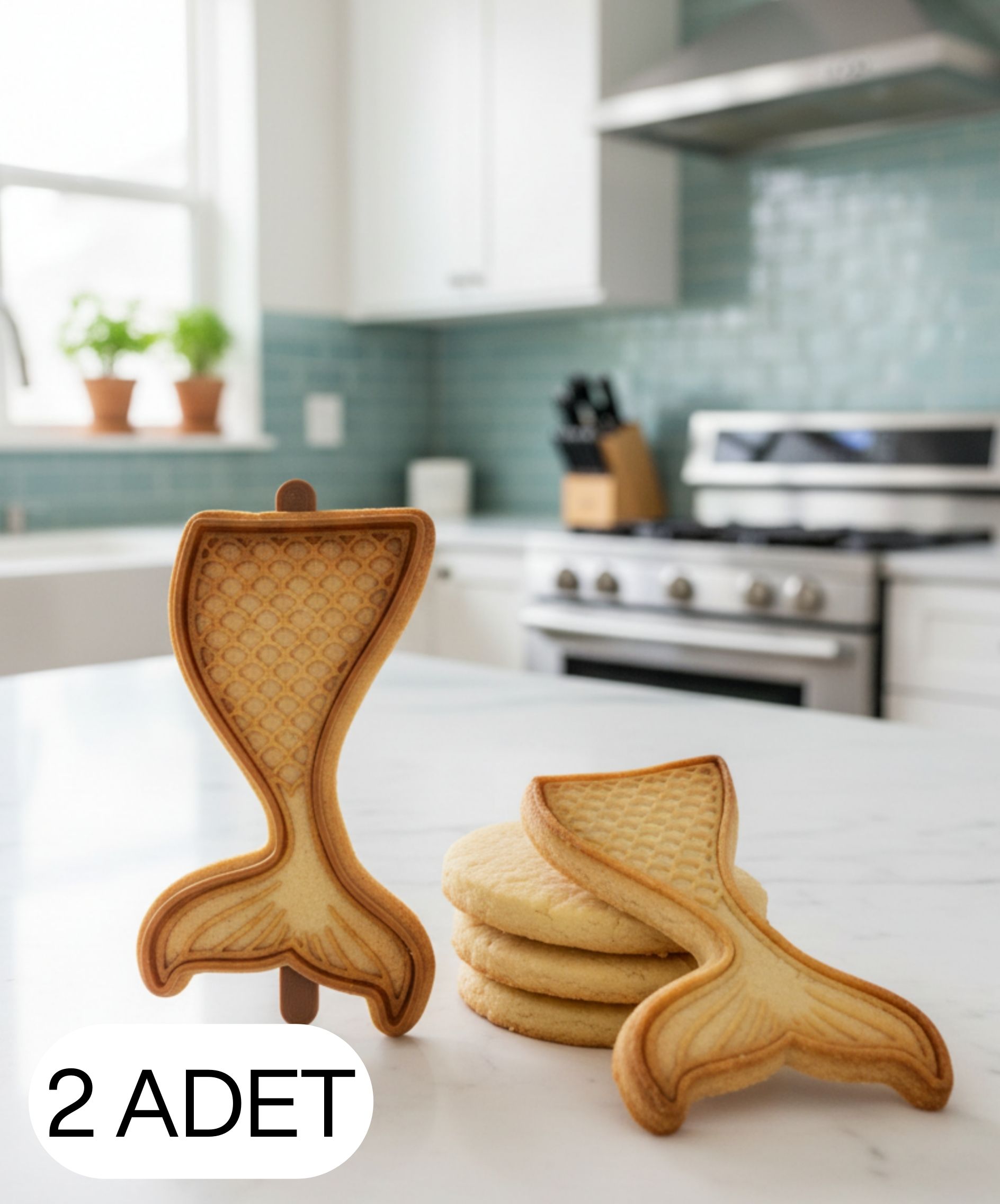 Bu ürün dış kesici kalıp ve iç detay desen kalıbı olmak üzere iki parçadan oluşmaktadır. Balık kuyruğu figürlü kurabiye kalıbı, gıda temasına uygun PLA malzemeden üretilmiştir. Dış kesici ile balık kuyruğu formu net şekilde çıkarılır, iç detay kalıbı ile pul dokusu ve kuyruk çizgileri belirginleştirilir. Bu sayede kurabiye, şeker hamuru ve oyun hamuru çalışmalarında net, dengeli ve karakterli desen çıkışı sağlar. Deniz temalı doğum günü kurabiyeleri, çocuklara özel atıştırmalıklar, yaz temalı sunumlar ve konsept ikramlıklar için tercih edilir.