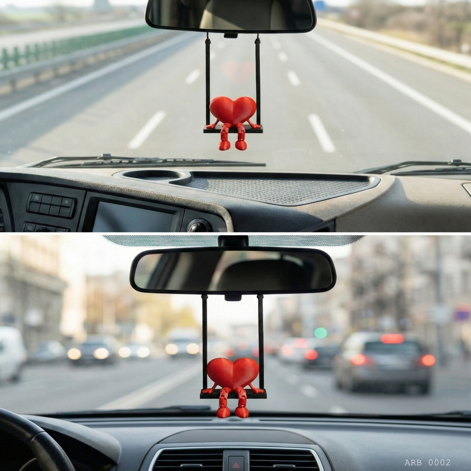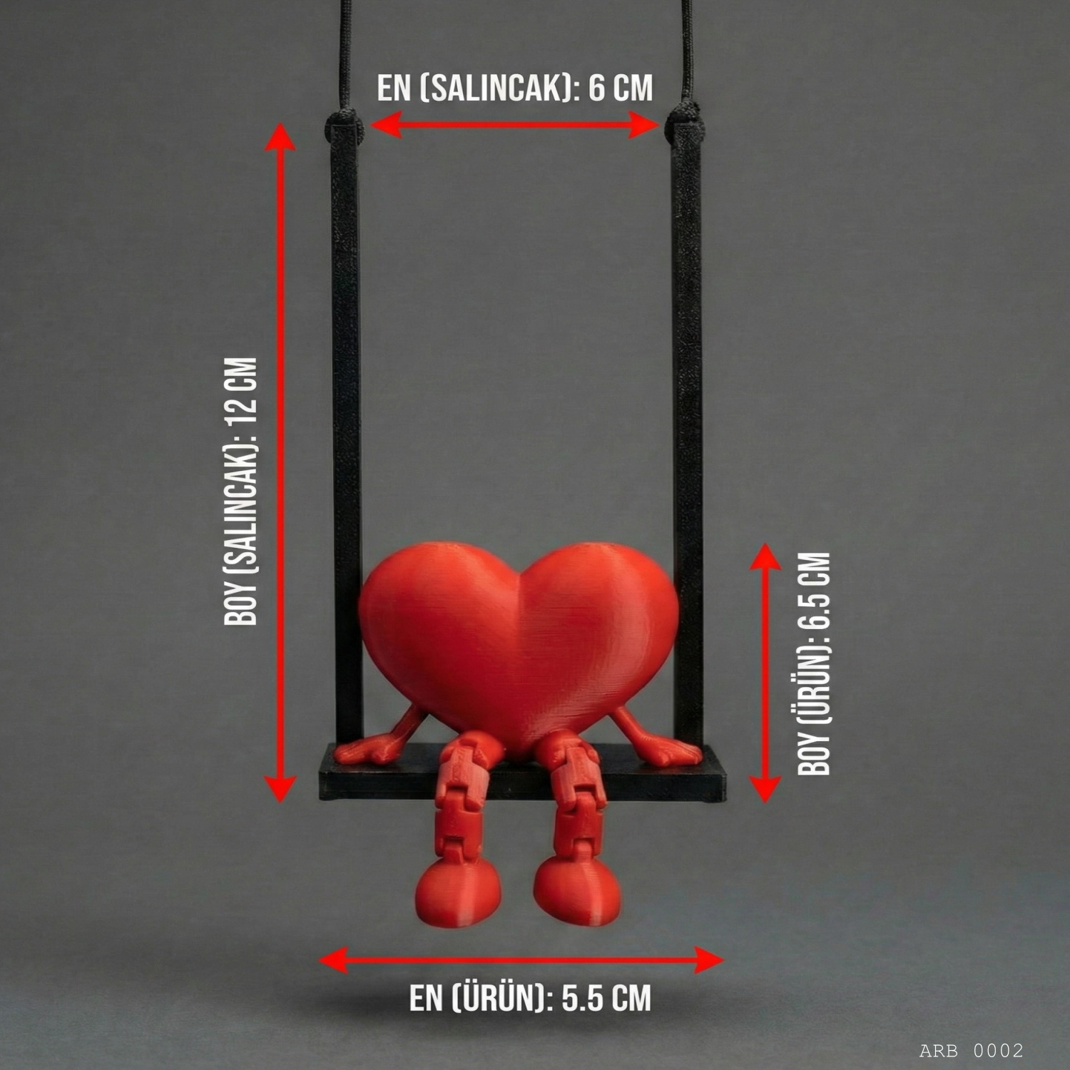 Bu ürün tek parça salıncak platformu ve kalp figürlü gövdeden oluşmaktadır. Dikiz aynasına asma ipi ile takılarak araç içinde dekoratif amaçla kullanılır. Kalp formu, dengeli yapısı ve salıncak tasarımı sayesinde araç hareketine bağlı olarak hafif, kontrollü bir salınım oluşturur ve iç mekânda hareketli bir görsel etki sağlar. Kompakt ölçüleri sayesinde doğru konumlandırıldığında görüş alanını minimum etkiler. Araç içi dekorasyonuna romantik ve karakteristik bir dokunuş katmak isteyenler için ideal bir aksesuardır.