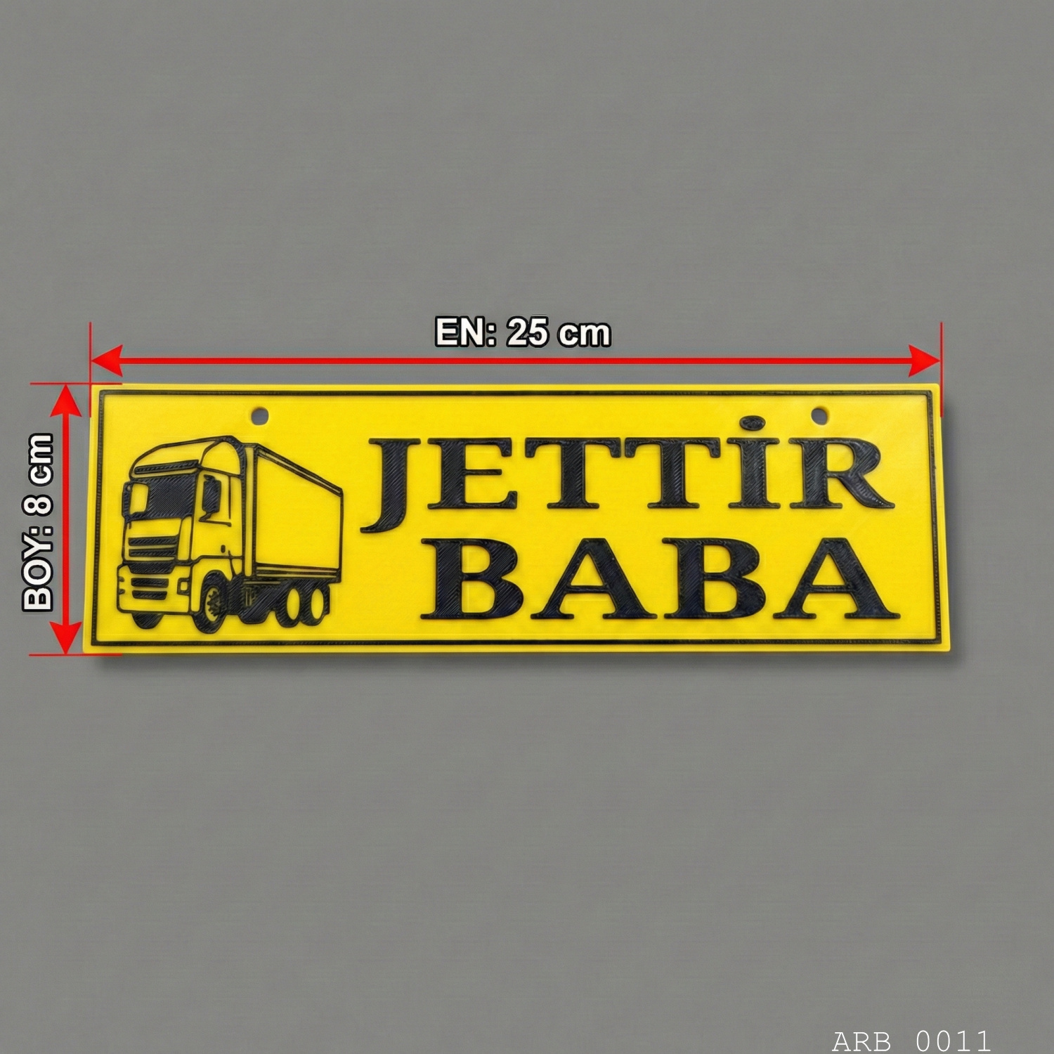“Jettir Baba” yazılı araç içi ön cam tabelası, kabin içinde dikkat çeken net ve okunaklı bir görünüm verir. Sarı zemin üzerine siyah yazı ve kamyon görseli tasarımı sayesinde gündüz/gece görüşte fotoğraflarda da güçlü durur. Vantuz ile cam yüzeye pratik şekilde tutunur; istenildiğinde iz bırakmadan sökülüp tekrar takılabilir.