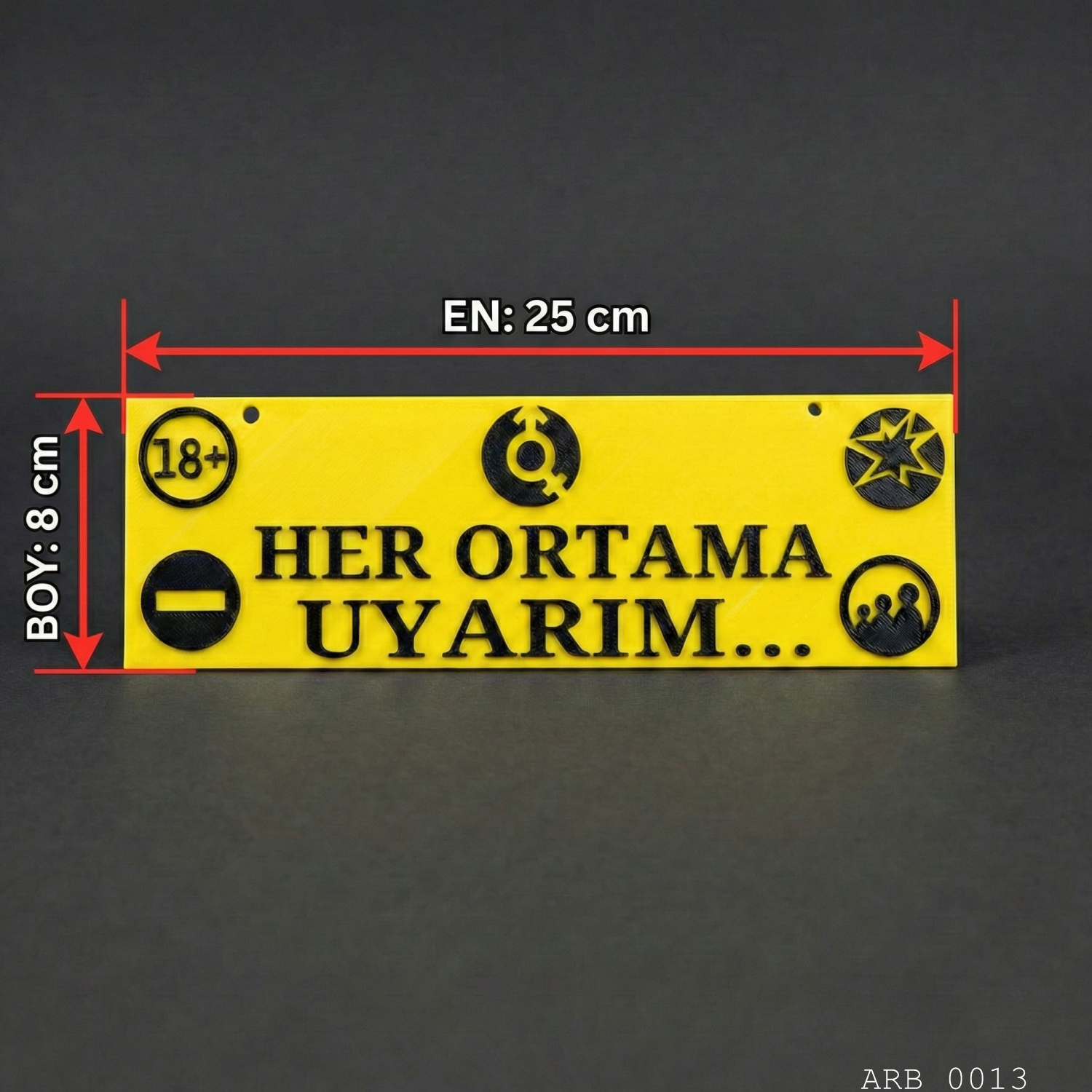 “Her Ortama Uyarım...” yazılı araç içi ön cam tabelası, kabin içinde dikkat çeken net ve okunaklı bir görünüm verir. Sarı zemin üzerine siyah yazı ve ikon detaylı tasarımı sayesinde gündüz/gece görüşte fotoğraflarda da güçlü durur. Vantuz ile cam yüzeye pratik şekilde tutunur; istenildiğinde iz bırakmadan sökülüp tekrar takılabilir.