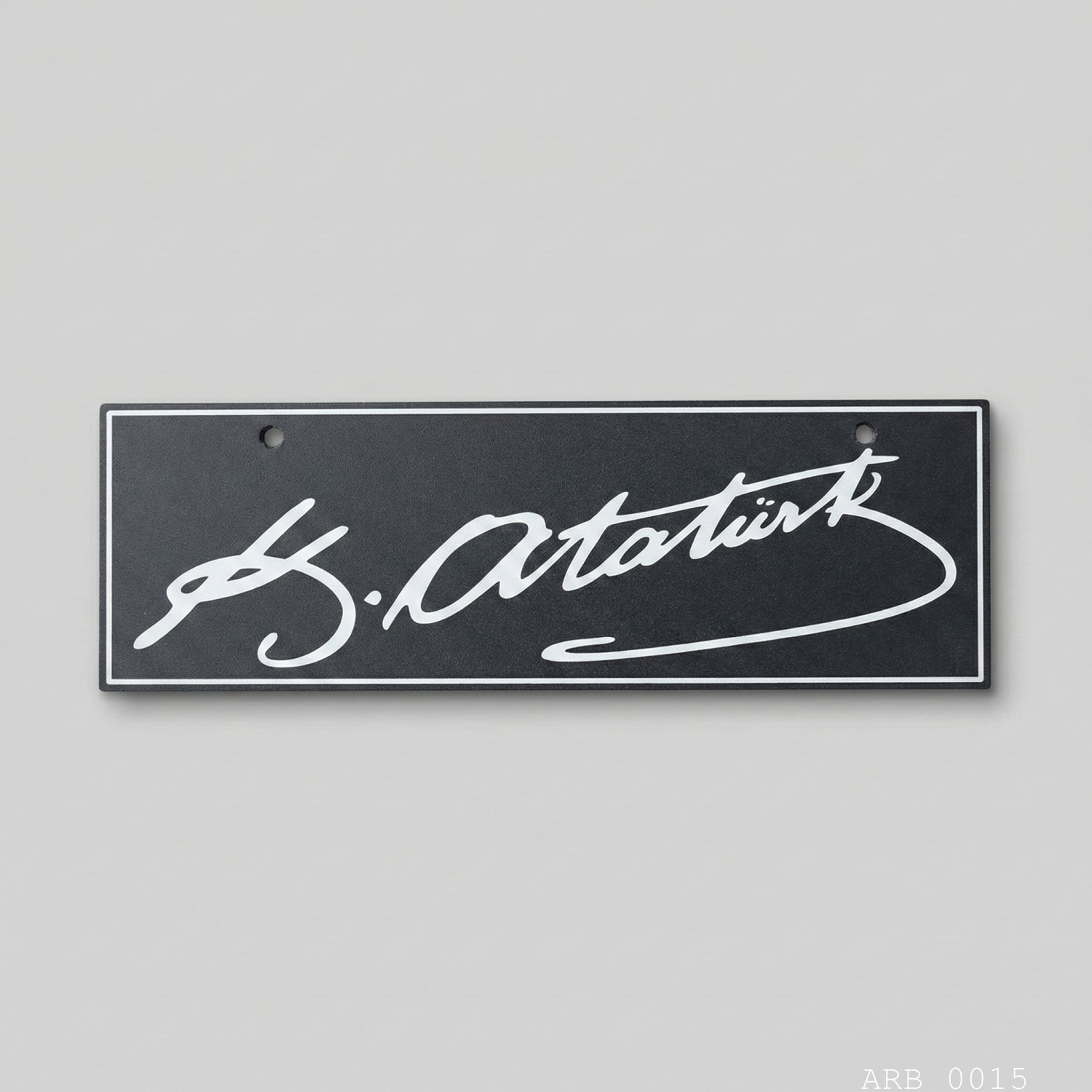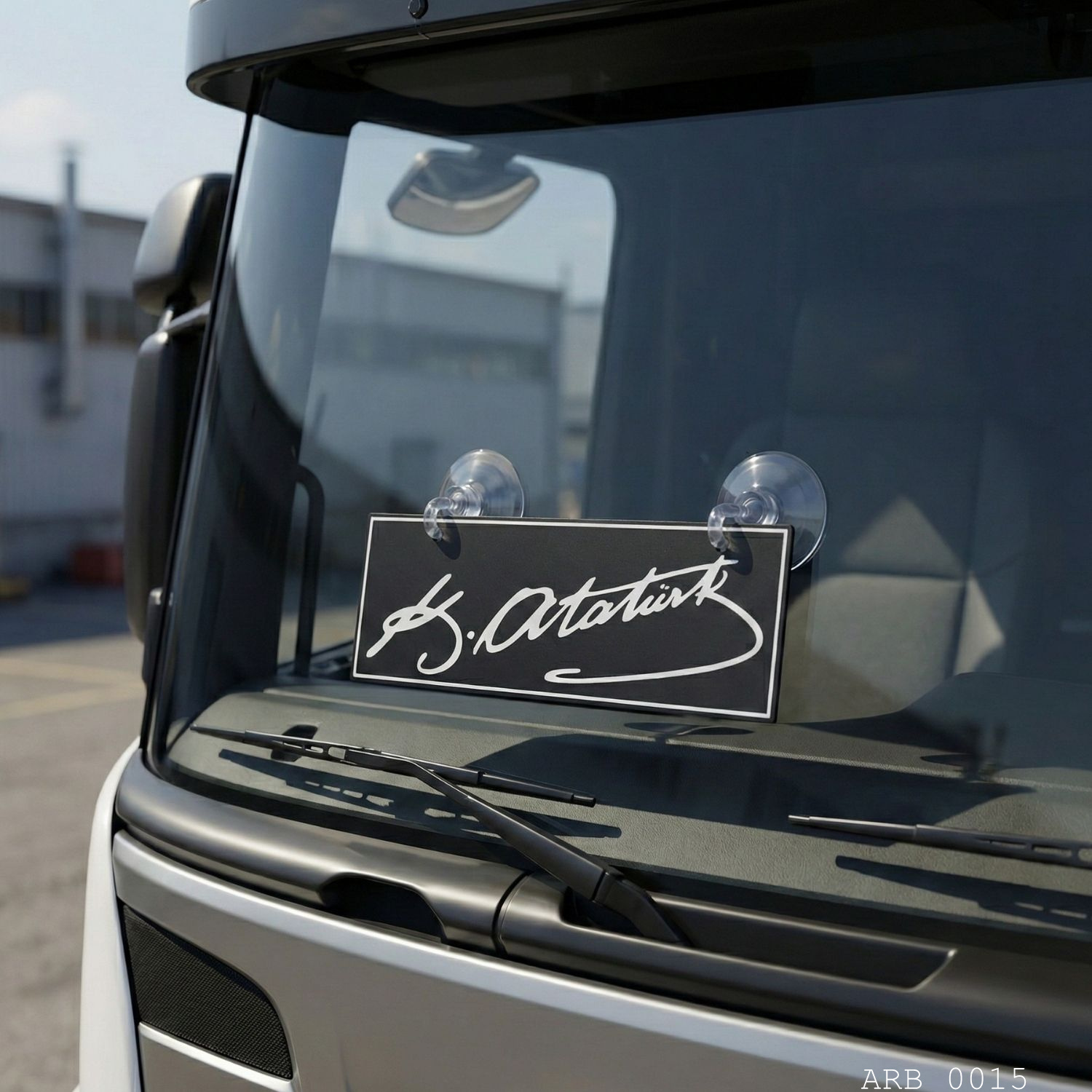 “Atatürk imzalı” yazılı araç içi ön cam tabelası, kabin içinde dikkat çeken net ve okunaklı bir görünüm verir. Siyah zemin üzerine beyaz imza tasarımı sayesinde gündüz/gece görüşte fotoğraflarda da güçlü durur. Vantuz ile cam yüzeye pratik şekilde tutunur; istenildiğinde iz bırakmadan sökülüp tekrar takılabilir.