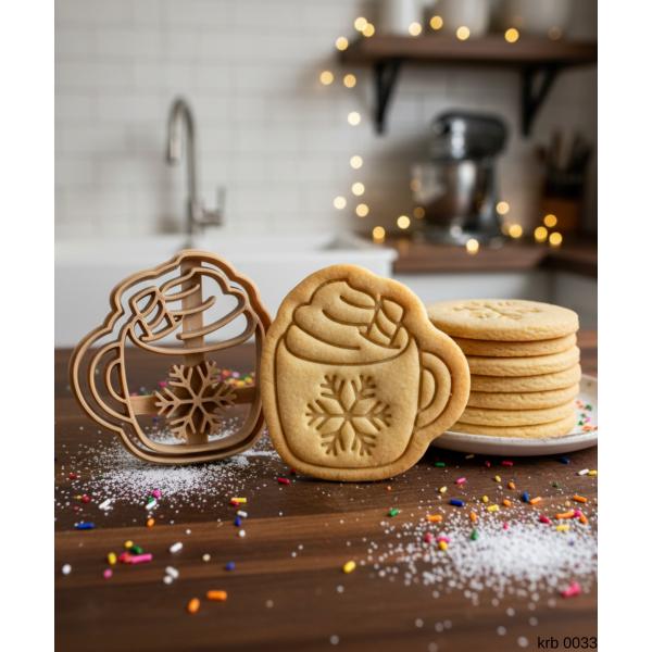 Kar taneli sıcak içecek kupası figürlü kurabiye kalıbı, gıda temasına uygun PLA malzemeden üretilmiştir. Bardak formu, üst köpük detayı ve ortadaki kar tanesi sayesinde kurabiye, şeker hamuru ve oyun hamuru çalışmalarında net, pürüzsüz ve karakterli şekiller elde edilir.
