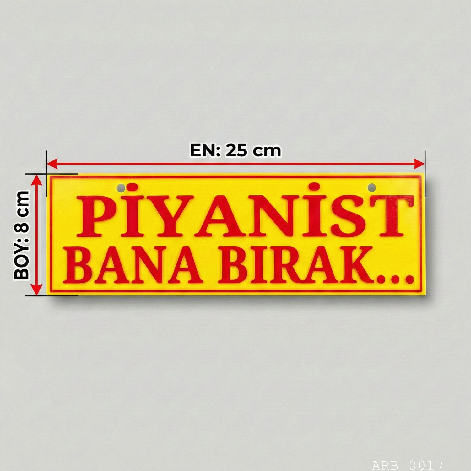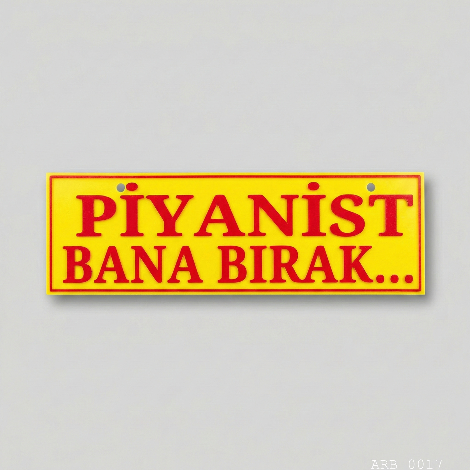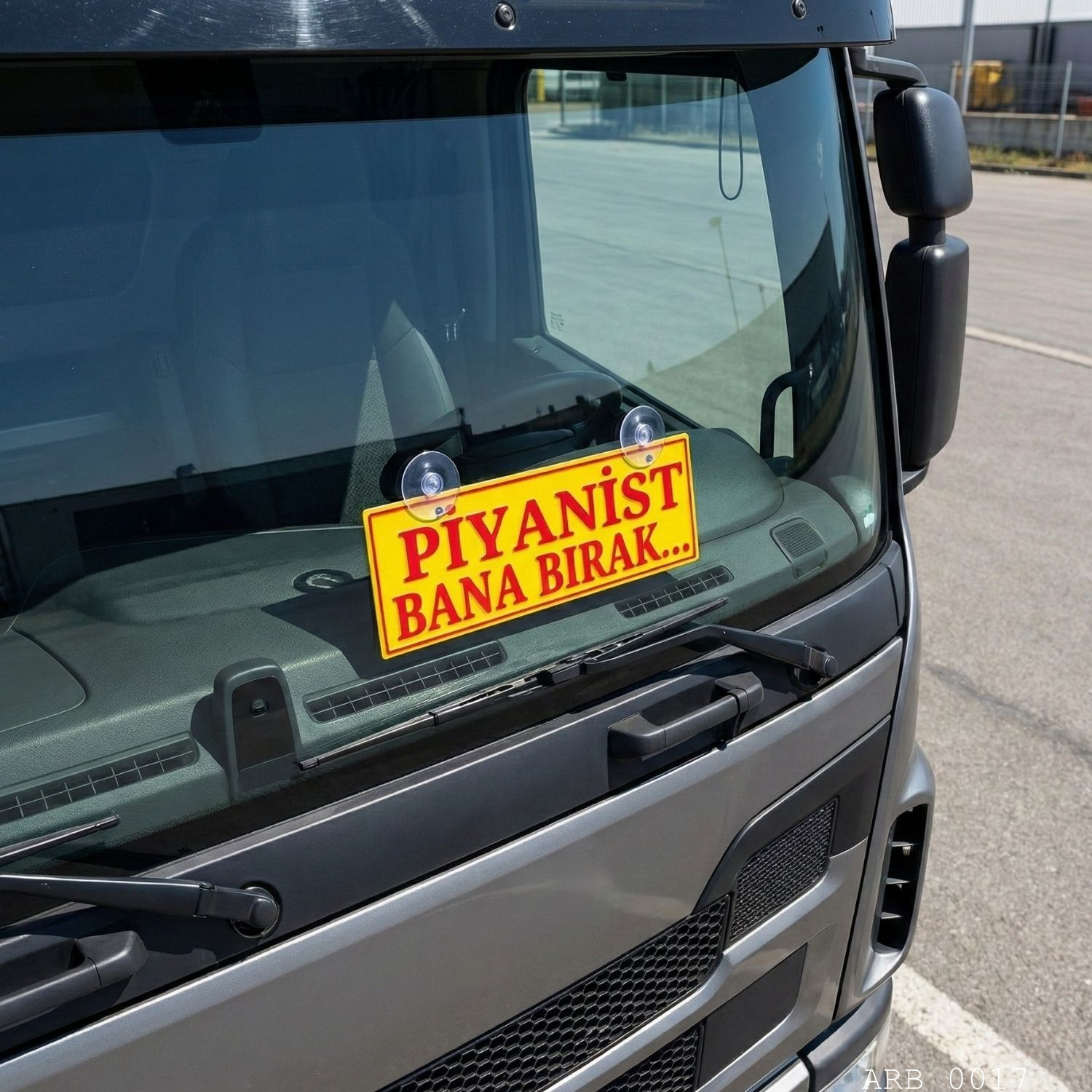 “Piyanist Bana Bırak...” yazılı araç içi ön cam tabelası, kabin içinde dikkat çeken net ve okunaklı bir görünüm verir. Sarı zemin üzerine kırmızı yazı ve çerçeve tasarımı sayesinde gündüz/gece görüşte fotoğraflarda da güçlü durur. Vantuz ile cam yüzeye pratik şekilde tutunur; istenildiğinde iz bırakmadan sökülüp tekrar takılabilir.