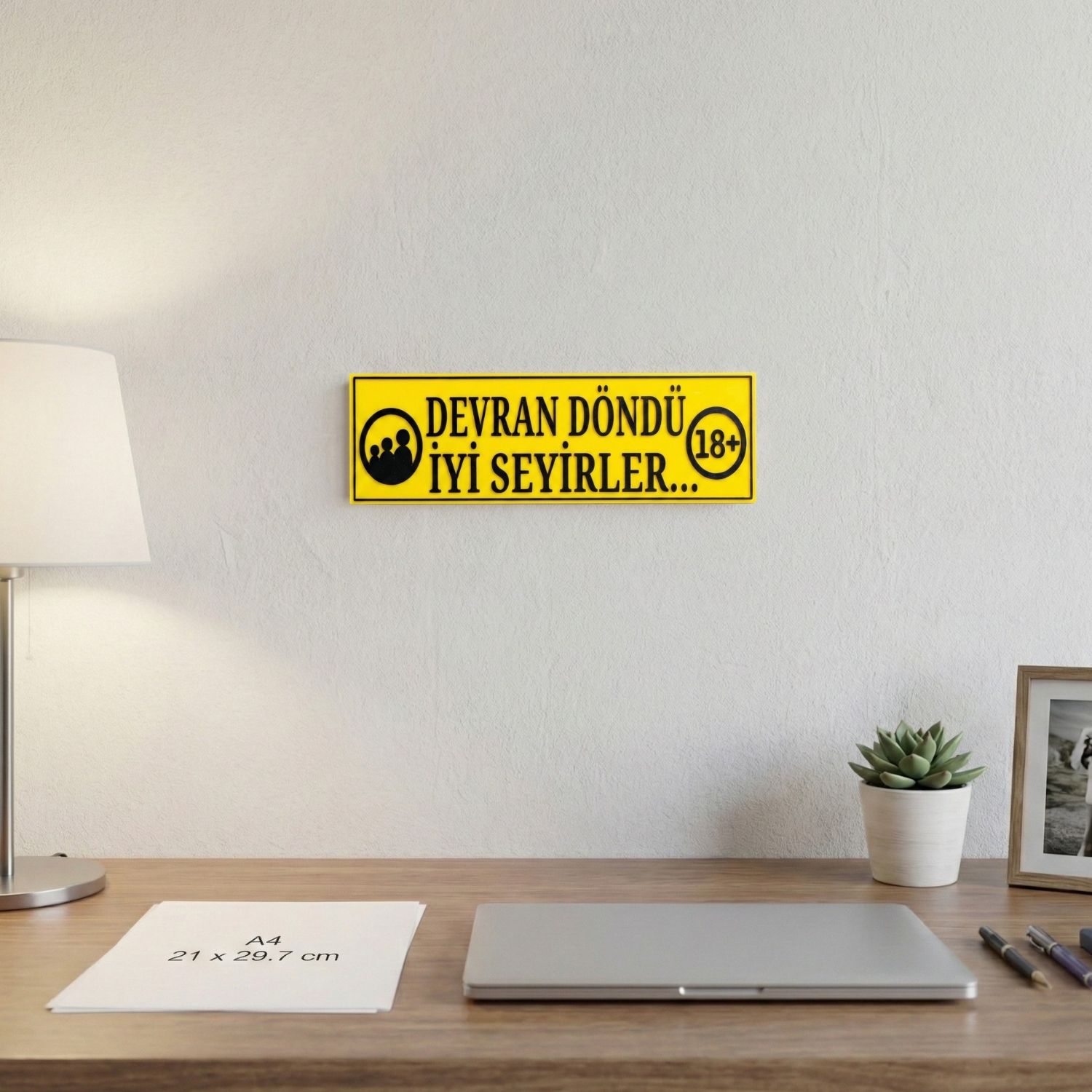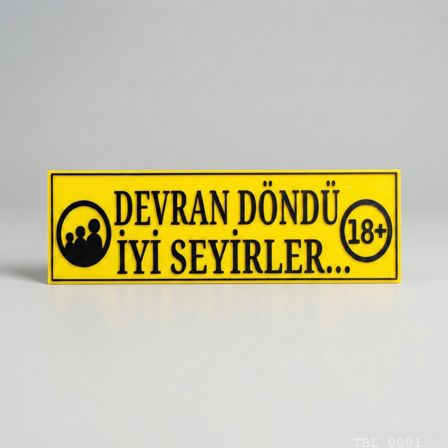 “Devran Döndü iyi Seyirler” yazili bu dekoratif tabela, bulundugu alanda dikkat ceken net ve okunakli bir gorunum verir. Sari zemin uzerine siyah yazi ve simgeli tasarimi sayesinde uzaktan bakista da guclu durur. Arka yuzeyindeki yapistirma bant ile pratik sekilde sabitlenir; istenildiginde dikkatli sekilde sokulup yeniden konumlandirilabilir.
