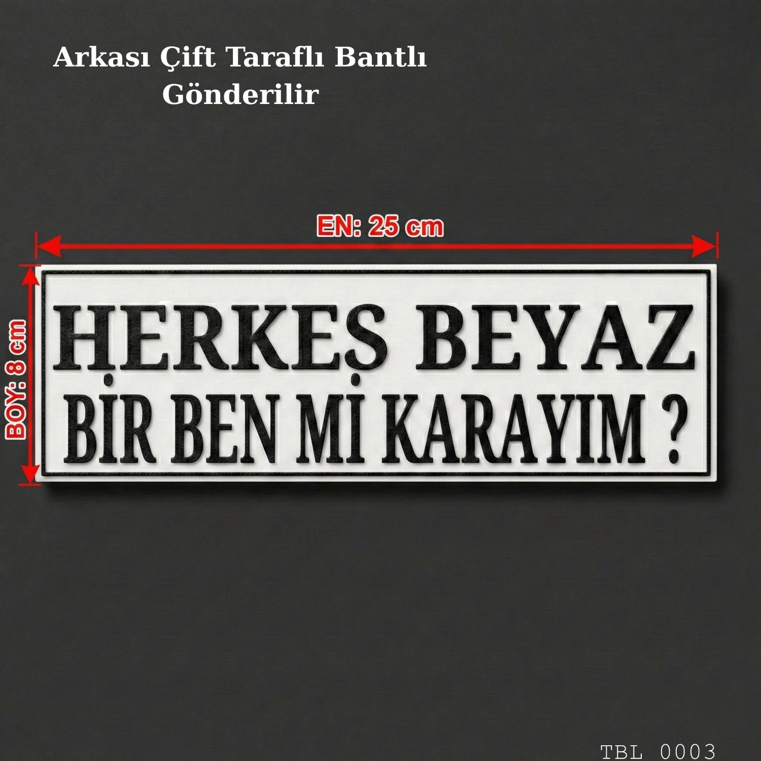 “Herkes Beyaz Bir Ben mi Karayim?” yazili bu dekoratif tabela, bulundugu alanda dikkat ceken net ve okunakli bir gorunum verir. Beyaz zemin uzerine siyah yazi tasarimi sayesinde uzaktan bakista da guclu durur ve ortama mizahi bir hava katar. Ev, ofis, atölye, calisma odasi gibi alanlarda duvar dekoru olarak kullanima uygundur.
