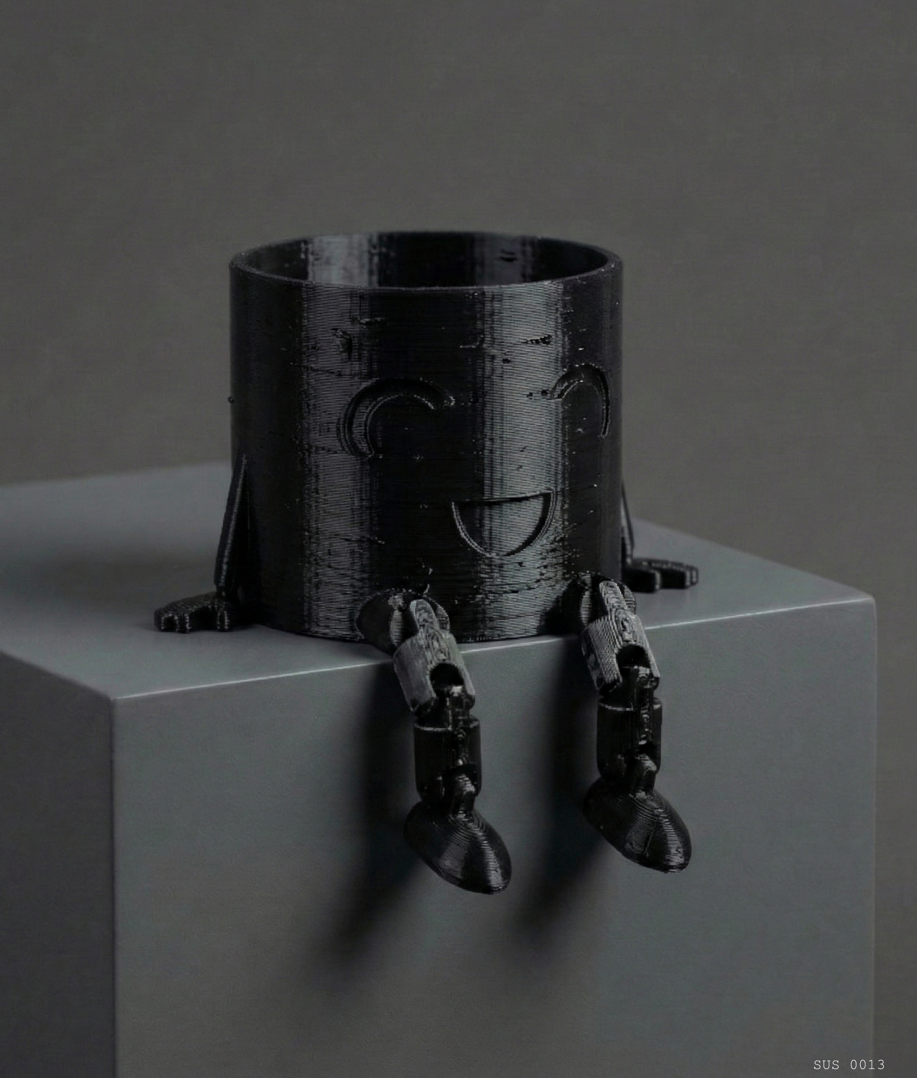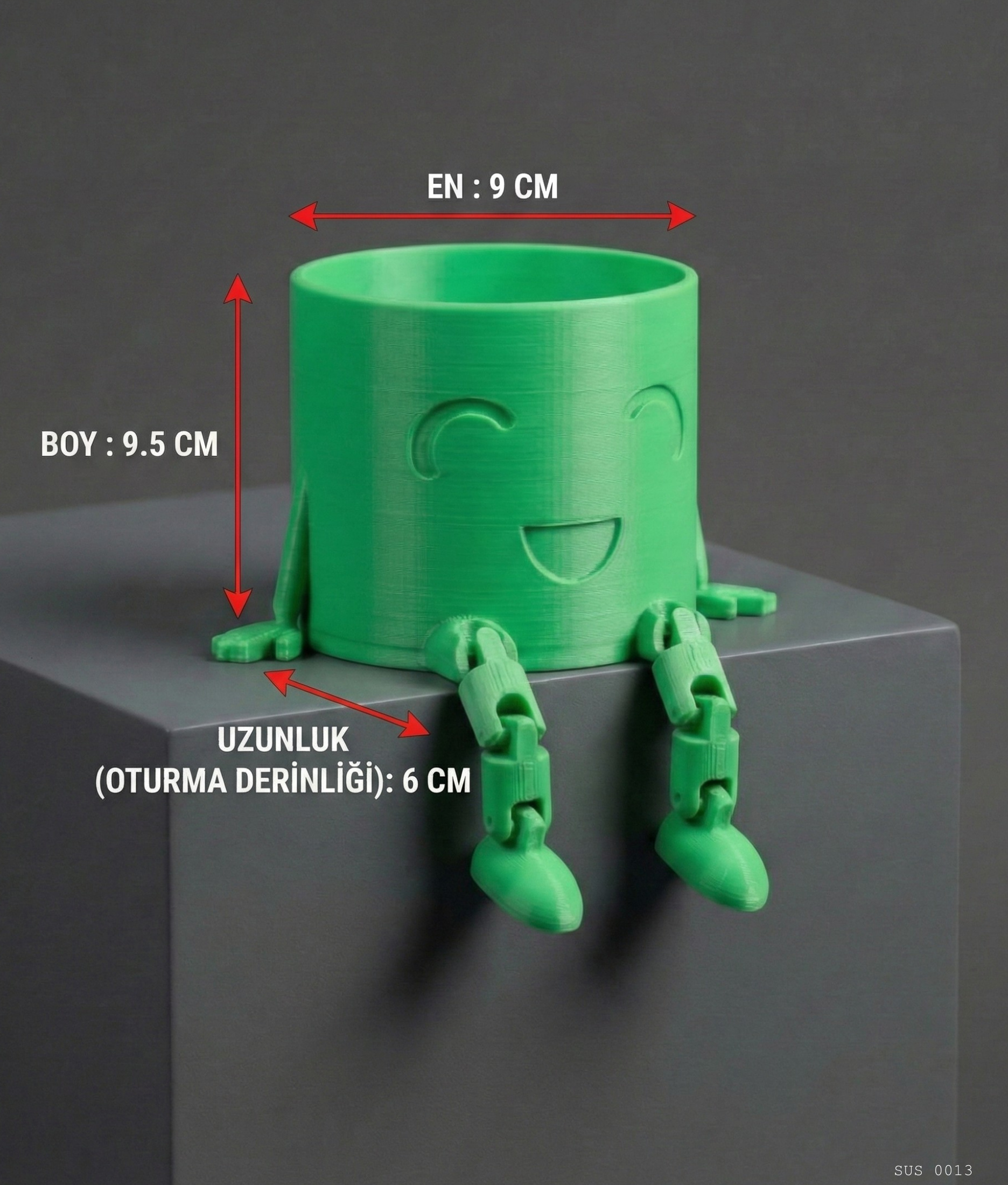 Sarkık ayaklı siyah gülümseyen büyük boy mini saksı, silindir formdaki gövdesi ve kenara oturabilen ayak yapısıyla masa üstü kullanımına uygundur. Ön yüzündeki gülümseyen ifade detayı bulunduğu ortama enerjik ve samimi bir hava katar.