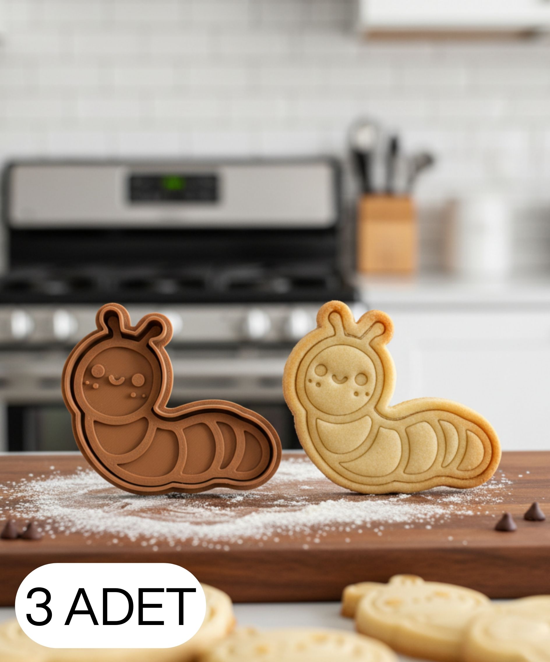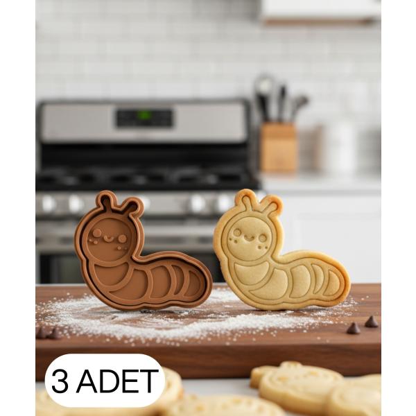 3Lü Sevimli Tırtıl Figürlü Kurabiye Kalıbı ve Hamur Kesici Şeker Oyun Hamuru İçin İki Parça Kalıp