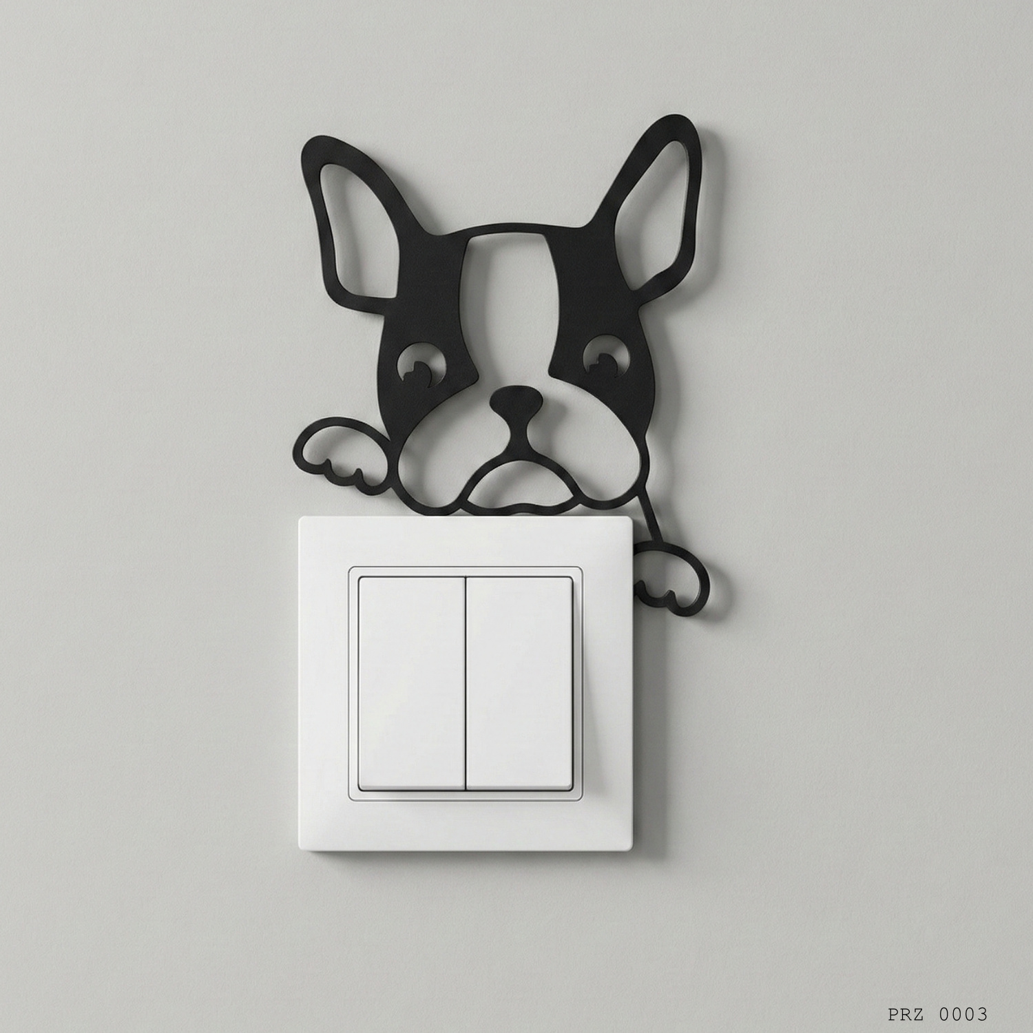 Köpek Figürlü Anahtar Priz Dekoru, anahtar veya priz çerçevesi etrafında dekoratif görünüm sağlayan figür formunda bir duvar aksesuarıdır. Köpek yüzü ve patileriyle anahtarın bulunduğu alanı daha sevimli ve düzenli bir görünüme taşır.
