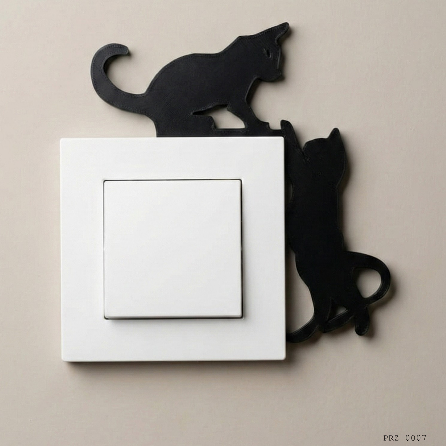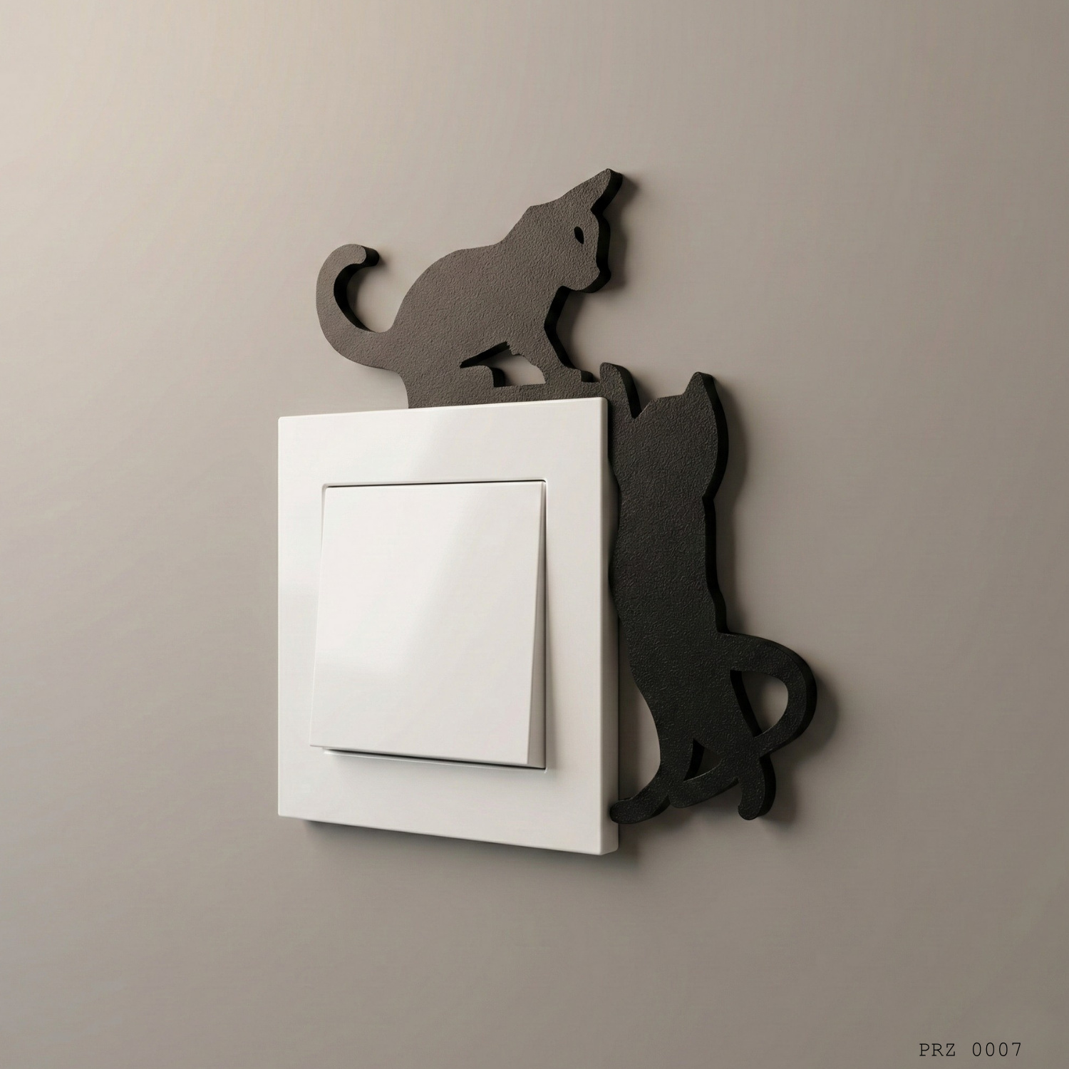 İki Kedi Figürlü Anahtar Priz Dekoru, anahtar veya priz çerçevesi etrafında kullanılmak üzere tasarlanmış dekoratif bir duvar aksesuarıdır. Bir kedinin üstte uzandığı, diğerinin yan tarafta tırmandığı figür kompozisyonu ile anahtar alanına canlı ve eğlenceli bir görünüm kazandırır.