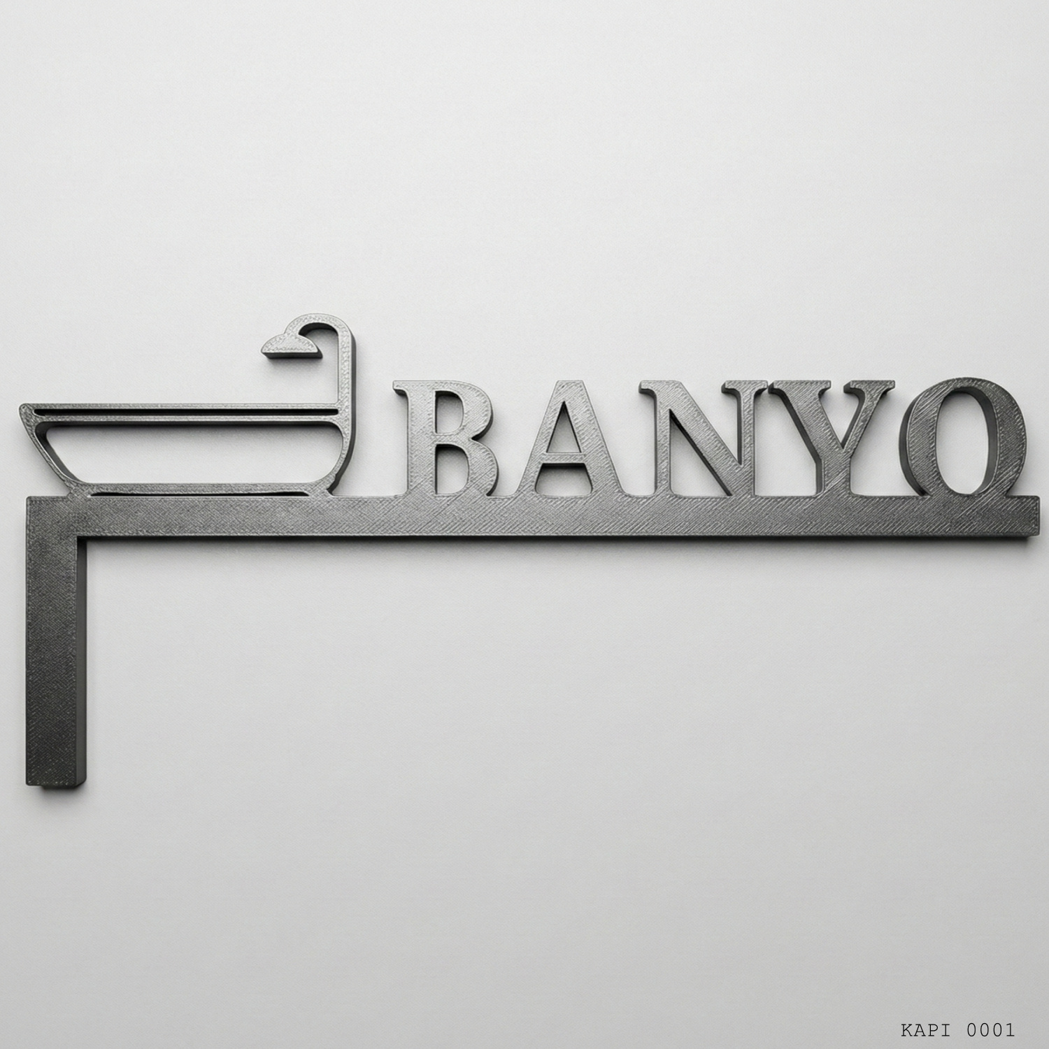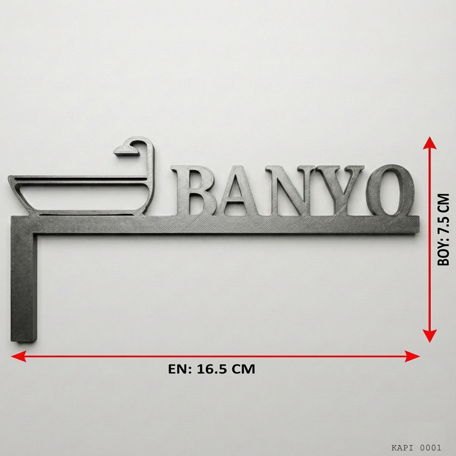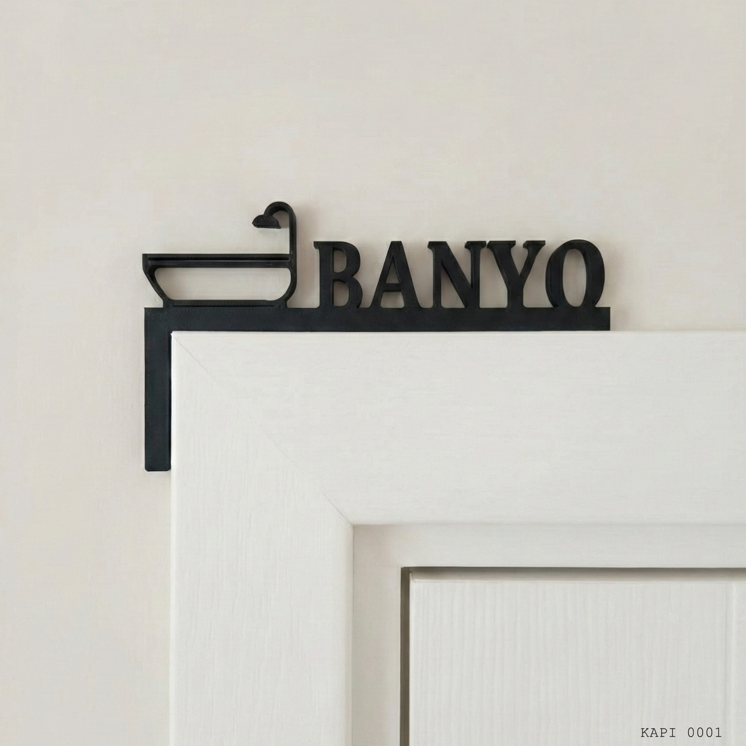 Banyo Yazılı Kapı Üstü Dekor, banyo girişlerini belirtmek için tasarlanmış yazı ve ikon kombinasyonlu dekoratif bir kapı üstü aksesuarıdır. Köşe formundaki tasarımı, kapı kasasının üst bölümünde konumlanarak mekanda yönlendirici ve düzenli bir görünüm oluşturur.