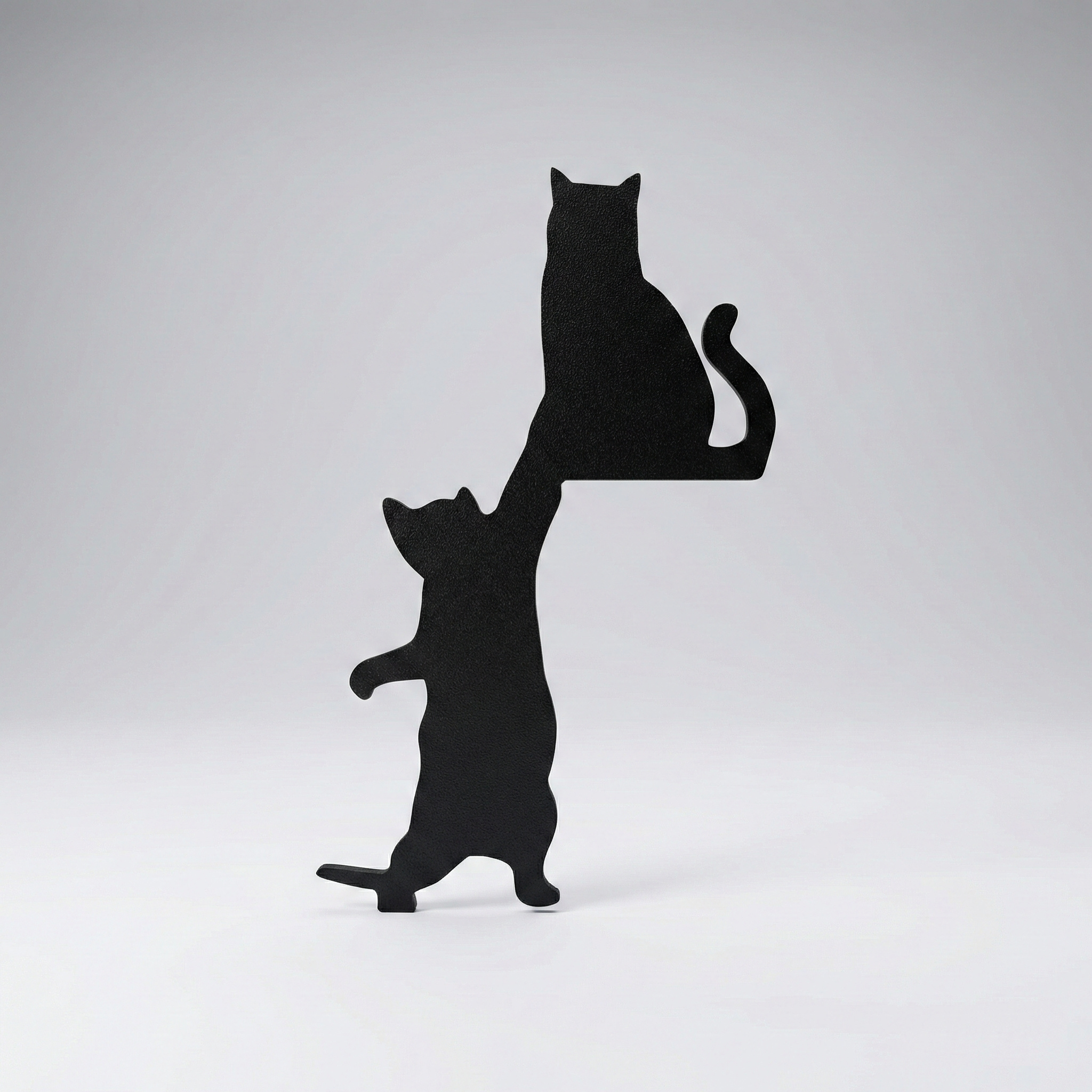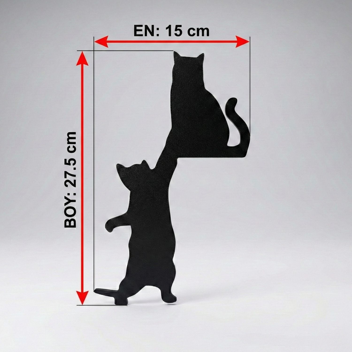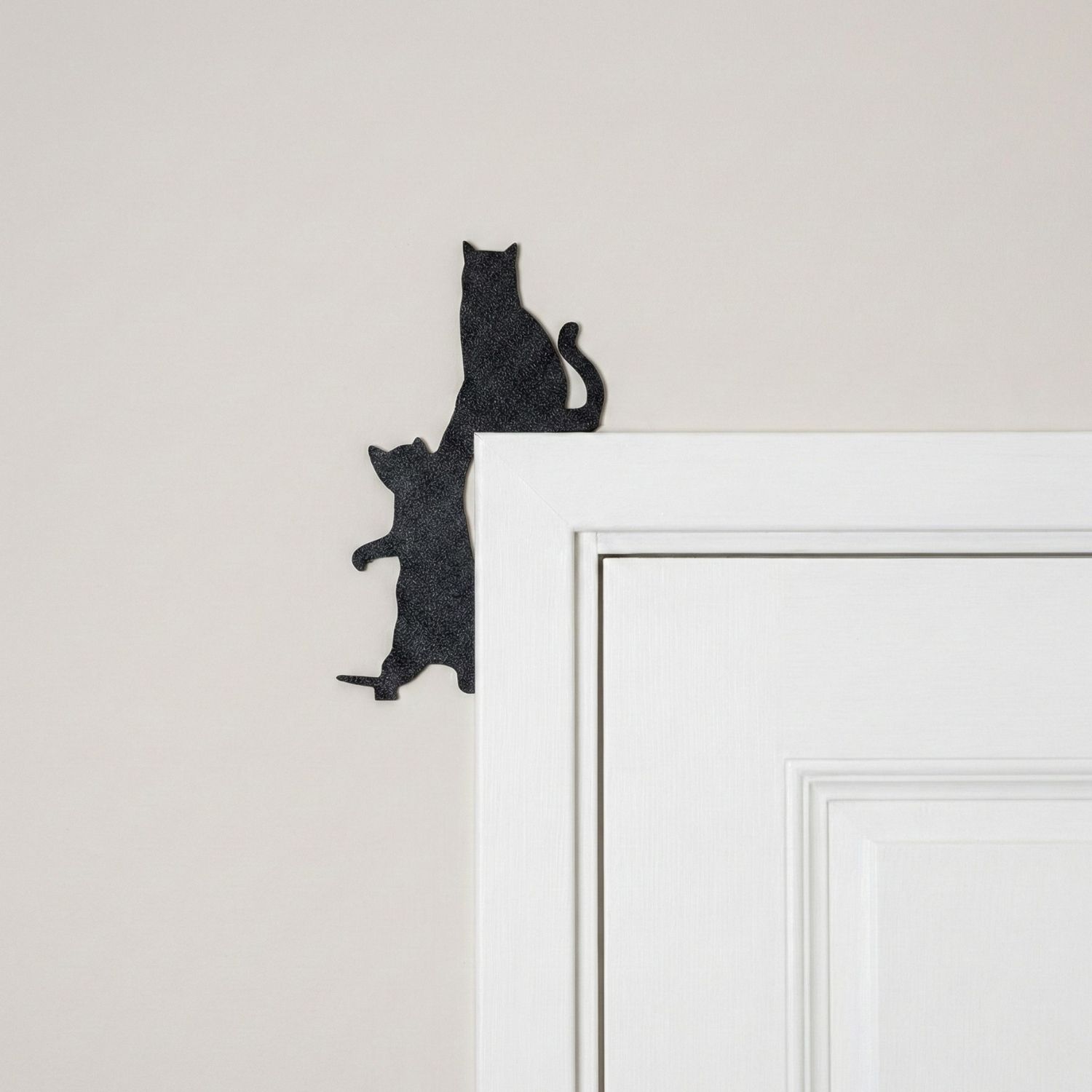 Iki Kedi Figurlu Kapi Kose Dekoru, kapi cercevesinin ust kose bolumunde kullanilmak uzere tasarlanmis figurlu dekoratif bir aksesuardir. Bir kedinin oturdugu digerinin yukari uzandigi kompozisyonu ile kapi girisine hareketli ve sicak bir gorunum kazandirir.