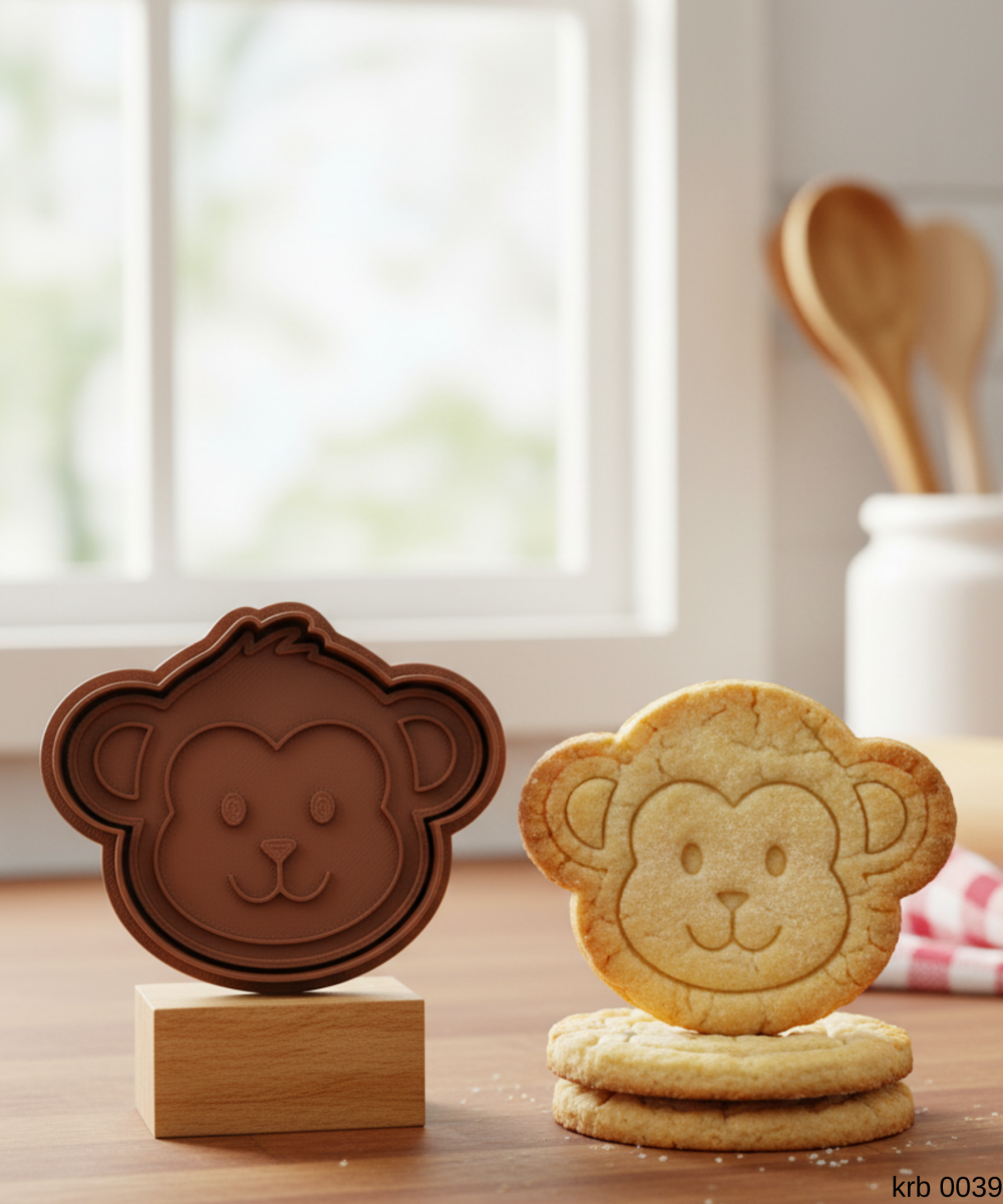 Maymun yüzü figürlü kurabiye kalıbı, gıda temasına uygun PLA malzemeden üretilmiştir. Gülümseyen yüz ifadesi, yuvarlak hatlar ve kulak detayları sayesinde kurabiye, şeker hamuru ve oyun hamuru çalışmalarında net, dengeli ve ifadesi güçlü sonuçlar elde edilir.
