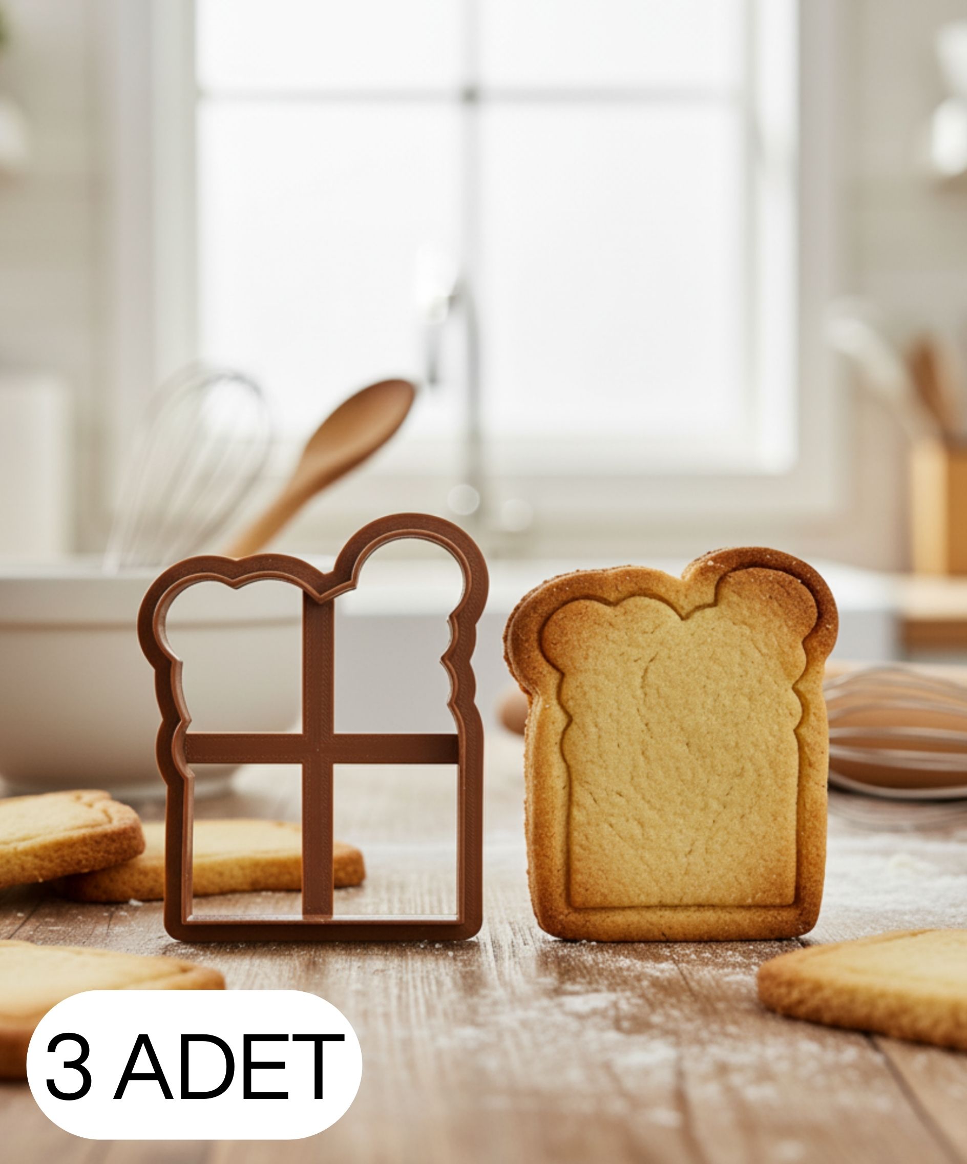 Bu ürün tek parça dış kesici formdan oluşmaktadır. Ekmek şekilli kurabiye kalıbı ve hamur kesici, gıda temasına uygun PLA malzemeden üretilmiştir. Tost ekmeğini andıran yuvarlatılmış üst hatları sayesinde kurabiye, şeker hamuru ve oyun hamuru çalışmalarında net, temiz ve iştah açıcı bir siluet çıkışı sağlar. Kahvaltı temalı kurabiyeler, çocuklara özel atıştırmalıklar, eğlenceli sunumlar ve konsept ikramlıklar için ideal bir figürdür. Tek parça yapısı sayesinde pratik, hızlı ve rahat kesim imkânı sunar.
